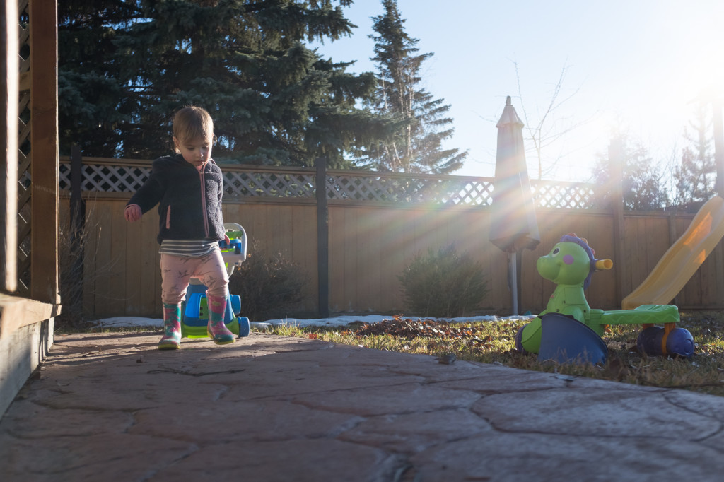 I was trying to find an angle that gave a bit more depth and interest to the image, but wasn’t getting anything stellar. To the left of me was a window-well, so I didn’t have the opportunity to lean against the wall as I would have liked. The blown out background and electrical cord hanging down from the roof (left over from Christmas lights!) was bothering me. Within 4 minutes or so she was bored of those toys anyhow, so we moved to our back field.